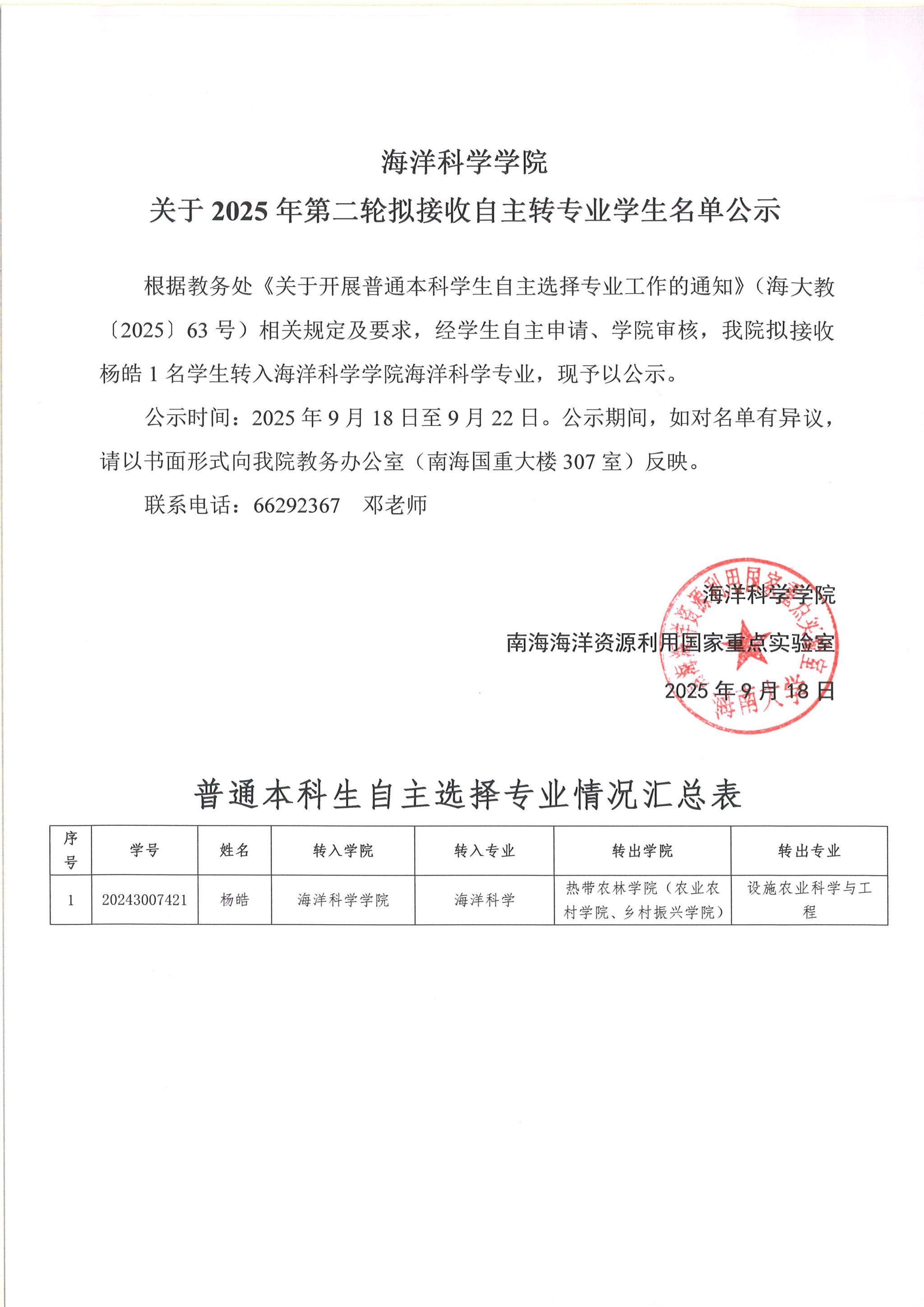 海洋科学学院关于2025年第二轮拟接收自主转专业学生名单公示