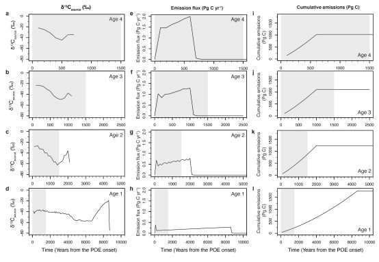 图2. 不同POE持续时间情景下cGENIE模拟的pH-δ13C双重反演结果:(a-d)碳源的δ¹³C值;(e-h)碳释放速率;(i-l)累计碳释放量。灰色阴影表示1500年时间窗口。